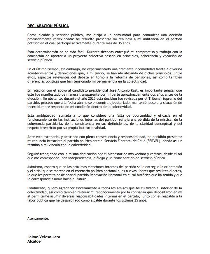 En una declaración pública, el alcalde Jaime Veloso Jara anunció su renuncia a su militancia en el partido Renovación Nacional (RN), poniendo fin a una trayectoria política de más de 35 años al interior de la colectividad.